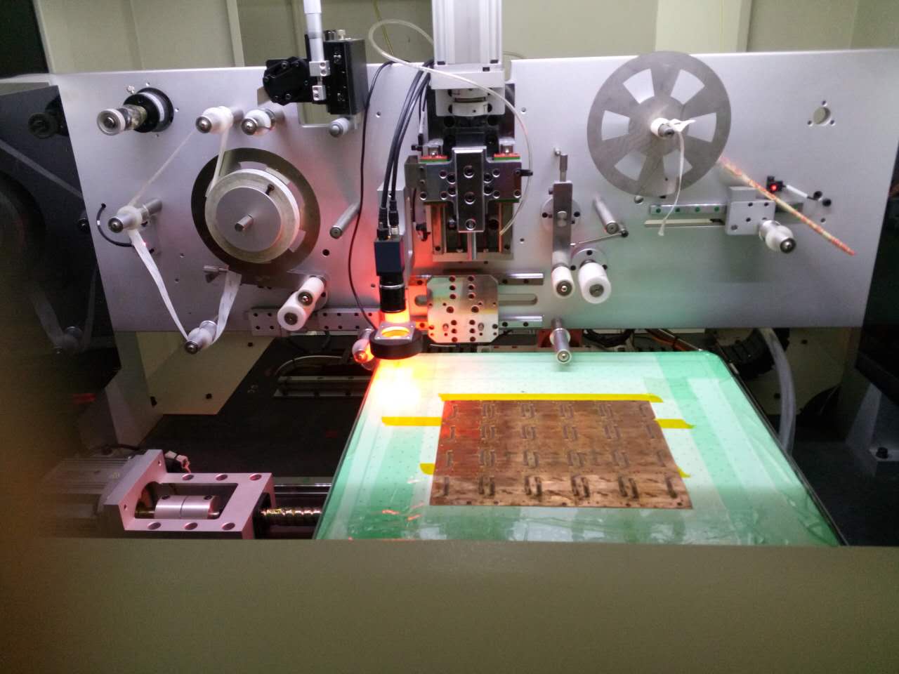 用途:主要運(yùn)用在柔性線路板行業(yè),將卷裝補(bǔ)強(qiáng)板原材料使用設(shè)備模具沖型,配合X、Y軸移動(dòng)與CCD相機(jī)掃描,將其貼合到設(shè)備加熱板之FPCB(柔性)