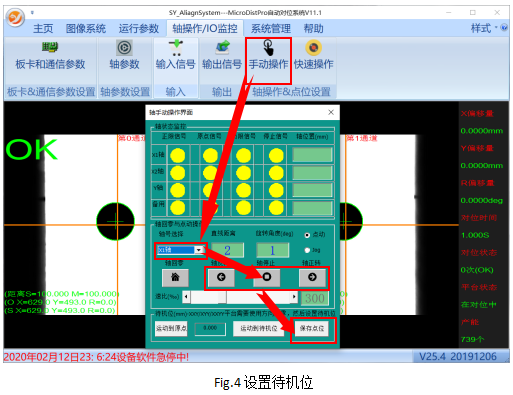 設置待機位之前需要啟動復位進行平臺回零,回零完成后點擊“軸操作/IO監(jiān)控”->“手動操作”彈出軸操作界面,選擇X1軸,填寫點動距離,通過手動點擊正反轉操控X1軸到限位中間位置,最后點“保存點位”。同理設定X2軸和Y軸的待機位置,如此便完成了對位平臺待機位的設定。