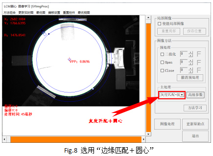 ? Step2:如圖8所示,下拉重新選擇“灰度匹配+圓心”,黃色的模板框工具和藍色的圓心工具則會顯示出來,通過拖拽調整使圓心工具的中環(huán)與Mark圓形邊緣相接,模板框位置和大小到合適,再點擊“方法學習”,則學習記錄當前的模板。
