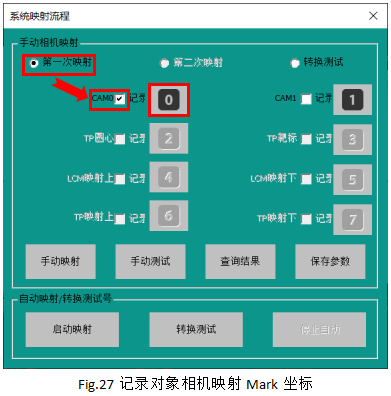 1) 系統(tǒng)全體停止,將帶有兩個Mark點的TP搬運到目標相機下,打開映射界面,勾選第一次映射,再勾選目標相機CAM1,點擊記錄按鈕,系統(tǒng)會抓取兩個Mark點的坐標。