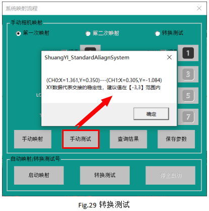 4) 重復1)、2)步驟,再搬運一次TP,抓點OK后點擊手動測試。CH數據需要在【-3~3】范圍內才算映射合格。代表產品交接穩(wěn)定,否則需要檢查抓點問題和機構交接的穩(wěn)定性問題。