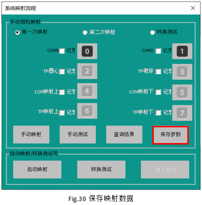 系統(tǒng)全體停止的狀態(tài)下,打開相機映射界面,放置好TP,點擊“啟動映射”,抓點OK完成第一次映射后,再點擊“轉換測試”進行一次轉換測試。