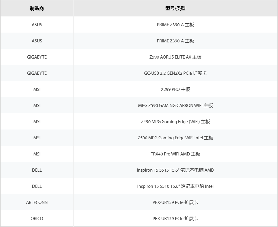 有各種主板和筆記本電腦采用了USB3.2Gen2x2。下文列出了一些配備至少一個(gè)USB3.2Gen2x2的主機(jī):