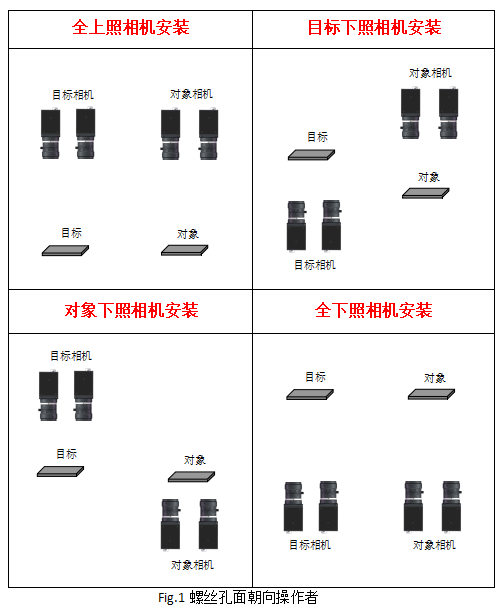 相機(jī)的安裝方向:以操作者站立調(diào)試的位置為基準(zhǔn)(一般就是顯示器的位置),相機(jī)的螺絲孔面朝向操作者,標(biāo)簽面(即正面)遠(yuǎn)離操作者。這樣才能保證實(shí)際圖像和顯示器圖像保持一致性,方便調(diào)試。