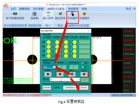 設(shè)置待機(jī)位之前需要啟動(dòng)復(fù)位進(jìn)行平臺(tái)回零,回零完成后點(diǎn)擊“軸操作/IO監(jiān)控”->“手動(dòng)操作”彈出軸操作界面,選擇X1軸,填寫點(diǎn)動(dòng)距離,通過(guò)手動(dòng)點(diǎn)擊正反轉(zhuǎn)操控X1軸到限位中間位置,最后點(diǎn)“保存點(diǎn)位”。同理設(shè)定X2軸和Y軸的待機(jī)位置,如此便完成了對(duì)位平臺(tái)待機(jī)位的設(shè)定。