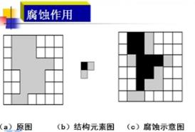 腐蝕運算作用:消除物體邊界點,使邊界點向內(nèi)部收縮,可以把小于結(jié)構(gòu)元素的物體去除。選取不同大小的結(jié)構(gòu)元素,去除不同大小的物體。如兩個物體間有細小的連通,通過腐蝕可以將兩個物體分開。