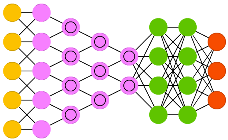 圖3顯示了CNN背后的典型設(shè)計(jì)。首先,可以使用具有多個(gè)維度的圖像或音頻文件作為輸入(黃色圓圈)。然后將執(zhí)行一系列卷積運(yùn)算,以便在多個(gè)層(粉色圓圈)上簡化或“卷積”輸入,并將一系列卷積運(yùn)算的輸出饋送到神經(jīng)網(wǎng)絡(luò)中。根據(jù)Van Veen(綠色圓圈),分析卷積輸出的神經(jīng)網(wǎng)絡(luò)通常是前饋神經(jīng)網(wǎng)絡(luò)。