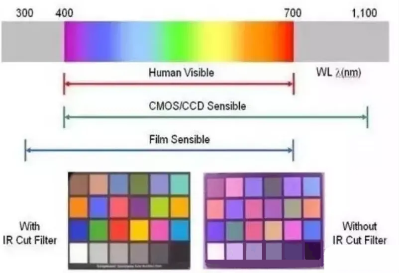 攝像頭鏡頭組件由一個(gè)很重要的構(gòu)件,就是濾波片;IR cut filter,即紅外截止濾光片,它放在于LENS與Sensor之間。因人眼與CMOS Sensor對(duì)各波長(zhǎng)的響應(yīng)不同,人眼看不到紅外光但sensor會(huì)感應(yīng),因此需要IR cut filter阻絕紅外光。