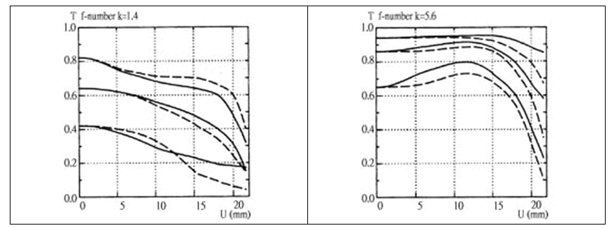 在透光率圖中,水平坐標代表從底片中心到邊角的距離。垂直坐標則代表著透光率高低。1.0表示在底片上所呈現(xiàn)的是100,透光(標準曝值),0.0表示完全不透光,0.6表示有60%的透光率。而在坐標中的虛線與實線,所代表的是不同光圈級數(shù)中所產生的透光率曲線。所有的鏡頭都會有不同程度的邊角失光現(xiàn)象,但是在經過放相成為照片之后,幾乎無法察覺這種失光現(xiàn)象,因為放大機的鏡頭也會有失光,所以在放相的過程中會形成一種互補的效應而消除了失光的現(xiàn)象。