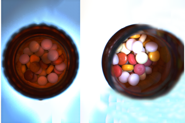 對于瓶裝的藥品,通常分玻璃瓶和塑料瓶。對于玻璃瓶,通常分為有色和無色的,無色的檢測起來會比較簡單,可以通過側(cè)面去做檢測,難度并不大。而對于有色玻璃瓶來說,因為玻璃本身的顏色影響,我們不論從側(cè)面還是正面都很難對藥丸采集到好的圖像,要分辨出藥丸的顏色就會有一定的難度,當(dāng)然,我們也有解決的辦法,那就是通過一定角度的采集配合合適的打光方式來進(jìn)行多方位的檢測。