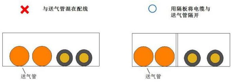 拖鏈電纜與送氣管等較硬的物體混在配線,容易造成電纜受壓斷線,可以使用隔板將拖鏈電纜與送氣管隔開。