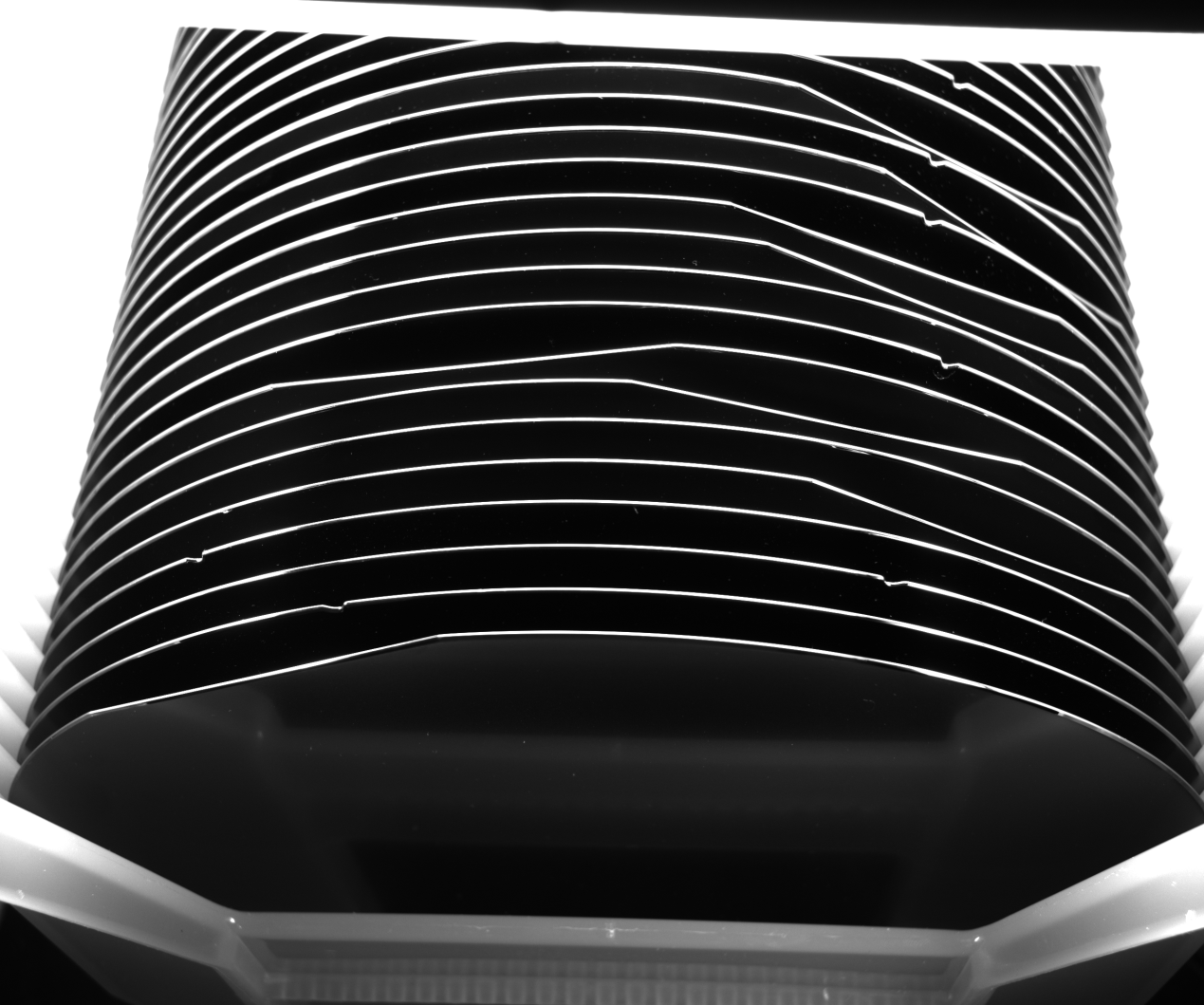 分選完成之后,在包裝之前,生產(chǎn)廠家需要對(duì)放入片盒的硅片進(jìn)行方向檢測(cè),客戶要求硅片產(chǎn)品的平邊或V槽需要在片盒中朝上能看到
