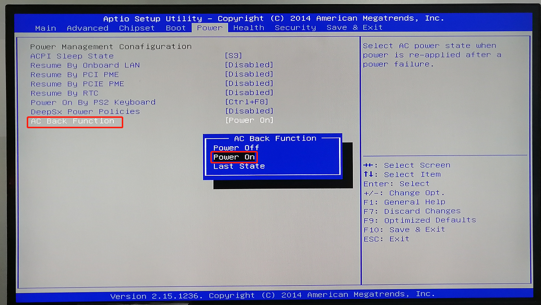 "選中AC Back Function "選項,設(shè)置為“Power On”,設(shè)置此選項的目的為電源開啟后,電腦自動啟動。