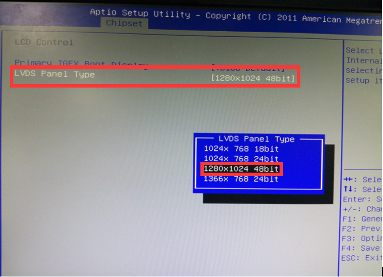 將"LVDS Panel Type"分辨率設(shè)定為1280x1024 48bit.