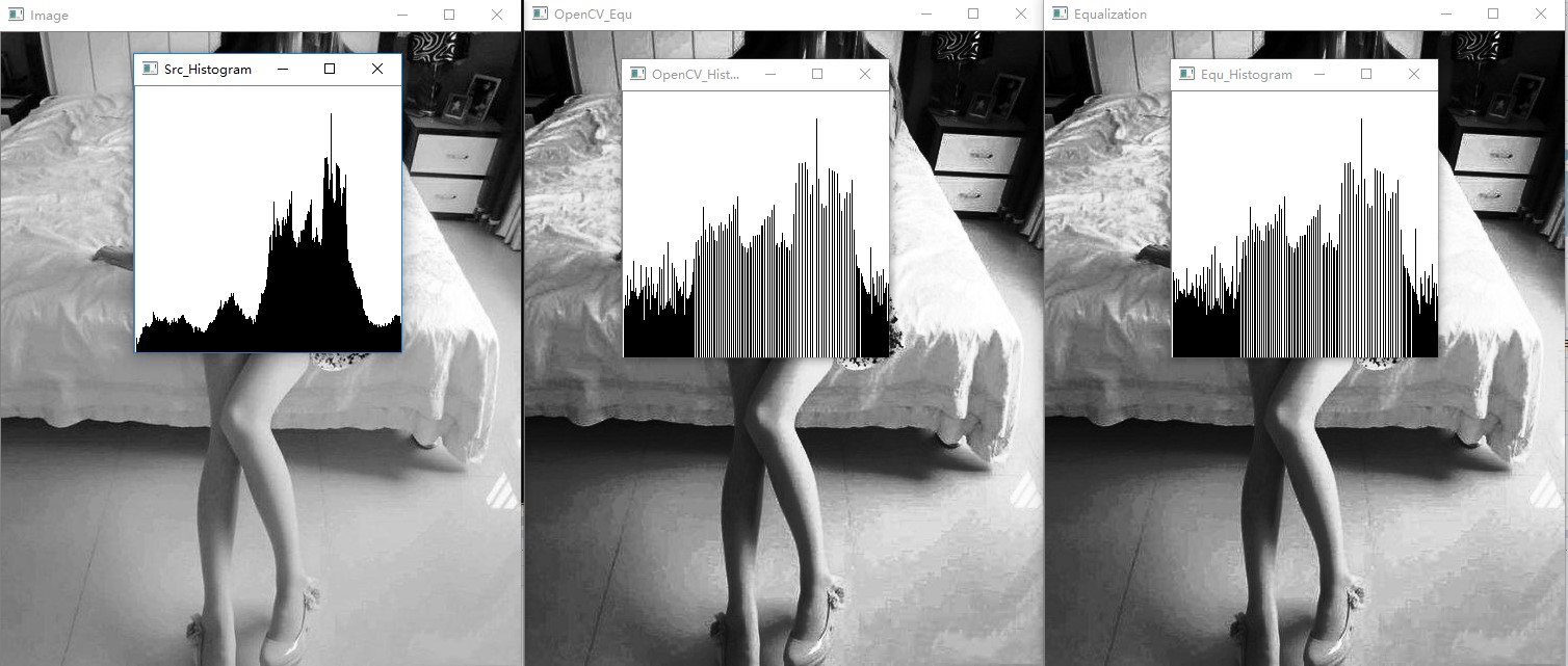 } 上面代碼只是加深下對均衡化算法流程的理解,實際在OpenCV中也提供了灰度均衡化的函數(shù)equalizeHist,該函數(shù)的使用很簡單,只有兩個參數(shù):輸入圖像,輸出圖像。下圖為,上述代碼計算得到的均衡化結果和調用equalizeHist的結果對比