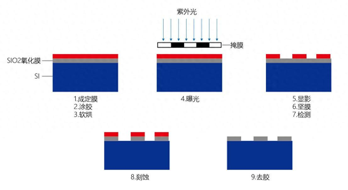 一般的光刻工藝要經(jīng)歷硅片表面清洗烘干、涂底、旋涂光刻膠、軟烘、對準(zhǔn)曝光、后烘、顯影、硬烘、刻蝕、檢測等工序。