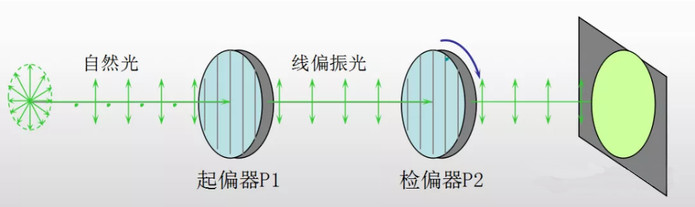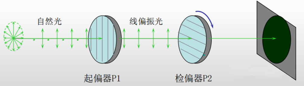 為了更好地理解光的偏振現(xiàn)象,我們可以借助實(shí)驗(yàn)裝置進(jìn)行生動(dòng)地闡述。在圖3、圖4中,P1(起偏器)、P2(檢偏器)是兩塊同樣的偏振片。在圖3中,自然光(如燈光或陽光)通過偏振片P1后,形成了偏振光。但由于人的眼睛沒有辨別偏振光的能力,故無法察覺。