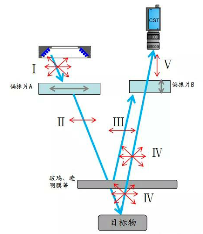 這里以透明包裝膜內(nèi)的工件檢測(cè)為例,闡述一下偏光光源的光路原理。如圖7所示,由光源發(fā)出的光Ⅰ經(jīng)過偏光片A得到如光Ⅱ的線偏振光。光Ⅱ遇到包裝膜時(shí)部分會(huì)發(fā)生鏡面反射,即產(chǎn)生光Ⅲ,同時(shí)部分會(huì)透射至目標(biāo)物表面并形成漫反射光Ⅳ。此時(shí)光Ⅳ經(jīng)過目標(biāo)物的反射,振動(dòng)方向發(fā)生變化,再透過玻璃面時(shí)偏光狀態(tài)仍然混亂,變成非偏振光。 在光Ⅲ和光Ⅳ中,光Ⅳ可透過偏光片B,變?yōu)楣猗酰ㄆ窆猓┎⒌竭_(dá)相機(jī)的CCD,但只含單方向偏光成分的光Ⅲ會(huì)被偏光鏡B擋住而不通過,因此可去除玻璃或者透明膜上的鏡面反光,輕松提取目標(biāo)物上的特征信息。