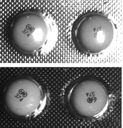 針對(duì)醫(yī)療行業(yè)中常見的藥片漏裝、缺陷檢測(cè),常常由于表面氣罩包的存在導(dǎo)致成像存在眩光(局部過曝),難以清晰地觀測(cè)內(nèi)部藥片情況。此時(shí)可以通過偏振光源實(shí)現(xiàn)表面清晰成像,去除氣罩包鏡面反射導(dǎo)致的眩光等現(xiàn)象。