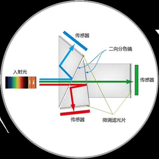 棱鏡相機的原理主要是通過棱鏡分光技術(shù),將入射光線分配到不同的通道中,每個通道的圖像可以在運動時或在不同的測量視角下實現(xiàn)像素級的對準精度。