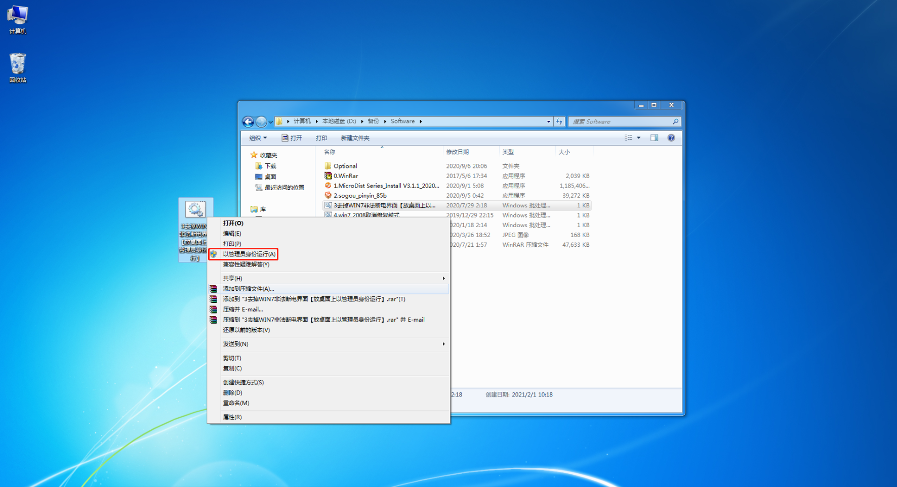 右鍵單擊“4去掉WIN7非法斷電界面【放桌面上以管理員身份運行】.bat”文件。