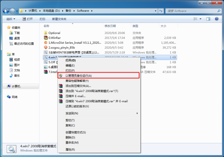 右鍵單擊文件“4.win7 2008取消修復模式.bat”。