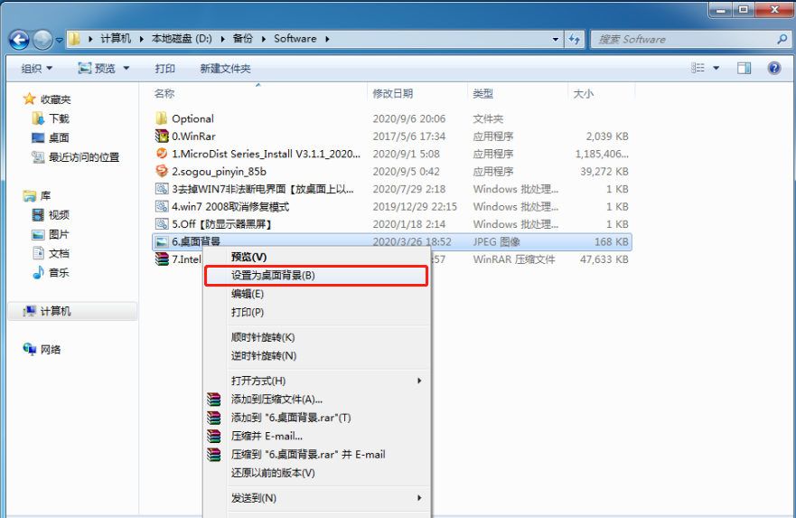 右鍵單擊文件“6.桌面背景.jpg”。點擊“設置為桌面背景”。