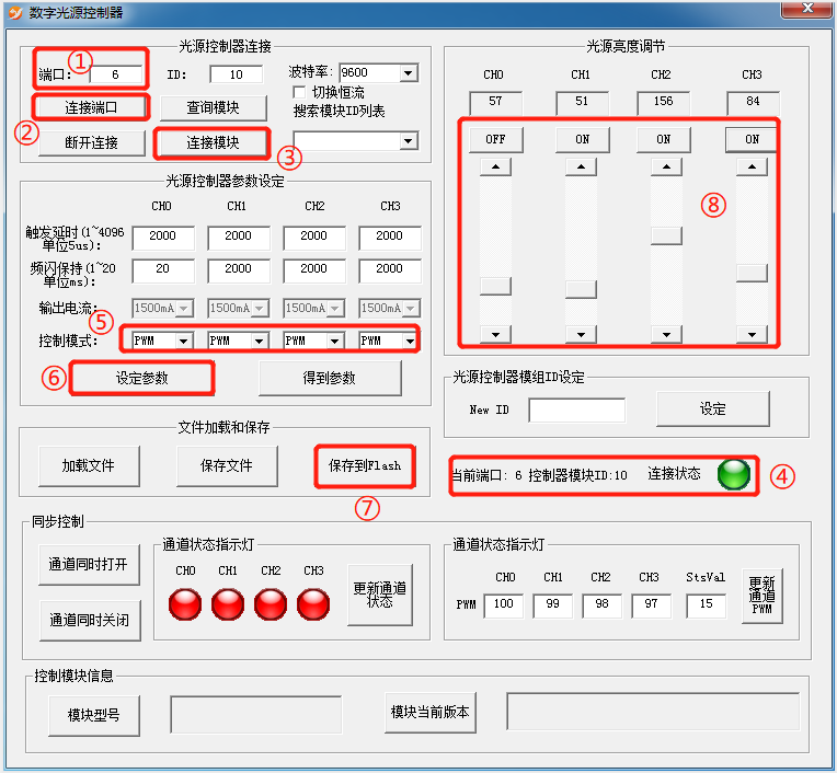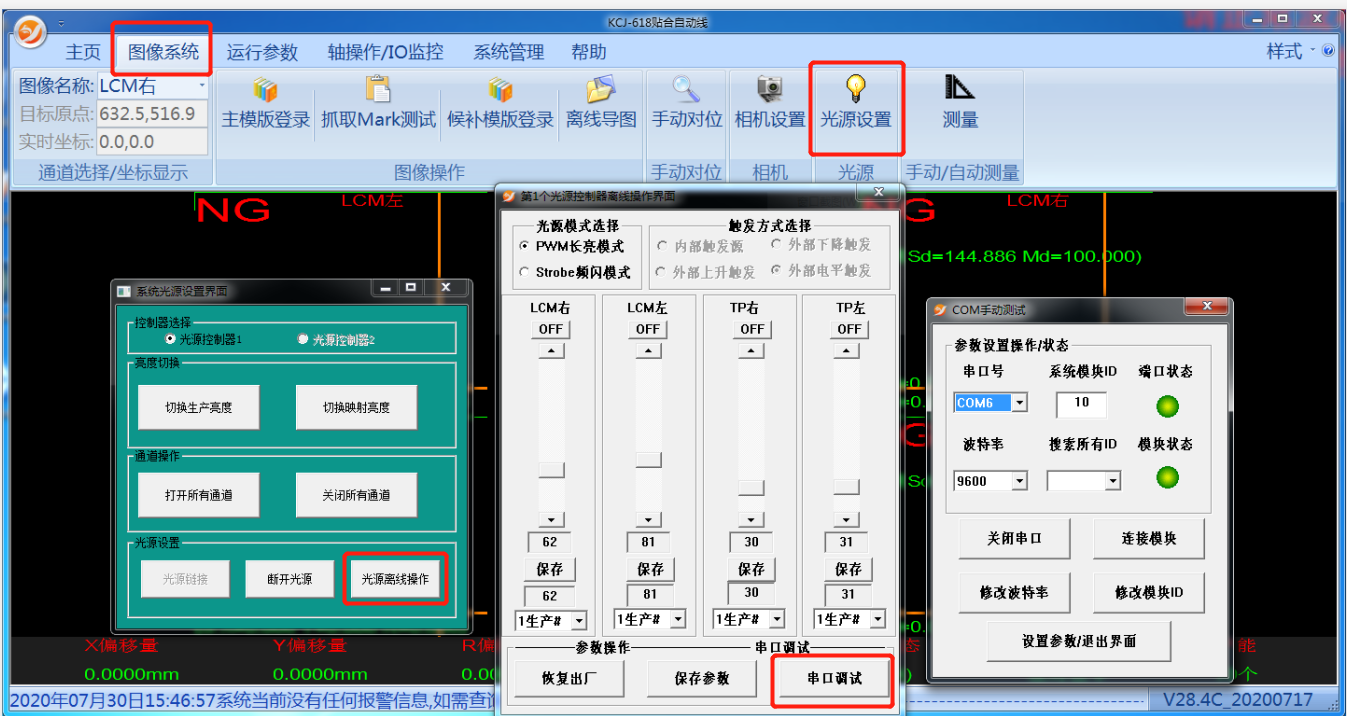 →將光源連接到光源控制器上,點擊圖中⑧所在區(qū)域中的按鈕及滑塊控制光源開關及亮滅,確認光源控制器無異常,如果異常請找技術確認問題并解決。