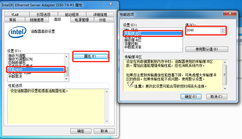 →點擊“高級”選項卡中的“性能選項”,點擊屬性,將“傳輸緩沖區(qū)”的值修改為最大值,圖中最大值為“2048”