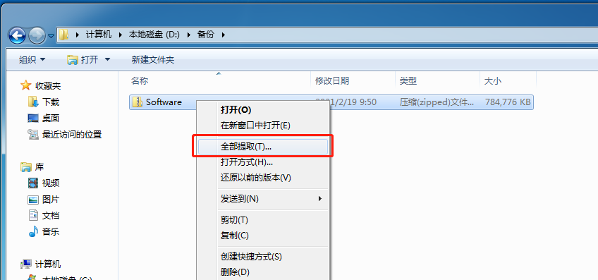 右鍵單擊Software.zip,選擇“全部提?。═)...”,彈出的對(duì)話框點(diǎn)擊“提取”。