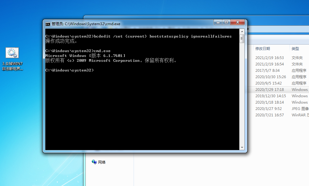 將文件“4去掉WIN7非法斷電界面【放桌面上以管理員身份運(yùn)行】.bat”拷貝到桌面。