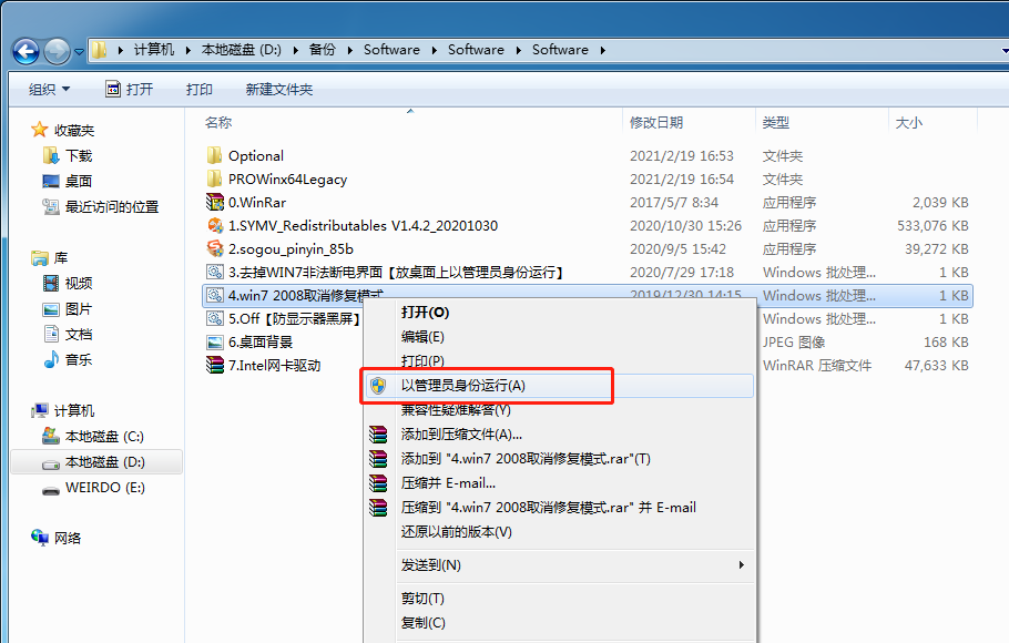 右鍵單擊文件“5.win7 2008取消修復(fù)模式.bat”。