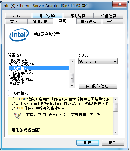 →將“高級(jí)”選項(xiàng)卡中的“巨幀數(shù)據(jù)包”屬性,修改為“9014 字節(jié)”