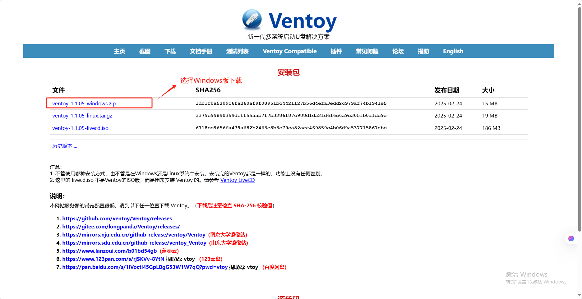 點(diǎn)擊“Download.Ventoy”進(jìn)入Ventoy下載頁面,并選擇Windows版下載
