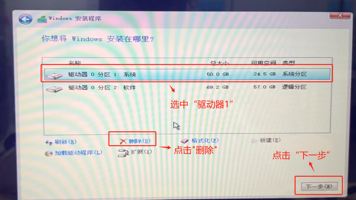 選中“驅(qū)動(dòng)器0分區(qū)1:系統(tǒng)”,點(diǎn)擊“刪除”,點(diǎn)擊“下一步”