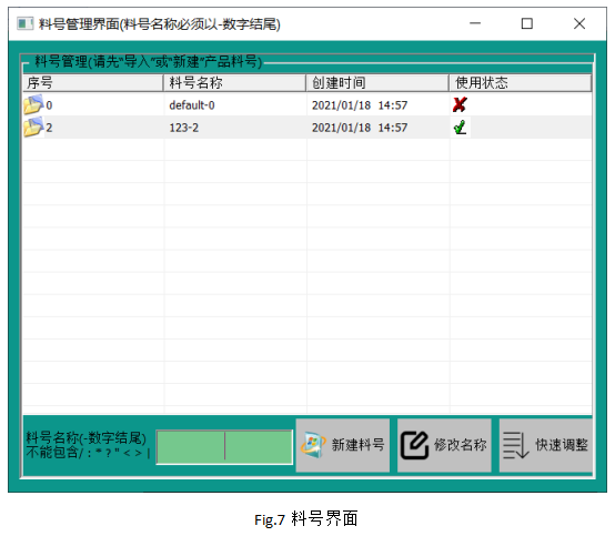 即為目前正在使用的料號。光標(biāo)在當(dāng)前料號時右鍵雙擊可刪除當(dāng)前料號,左鍵雙擊即導(dǎo)入當(dāng)前料號。