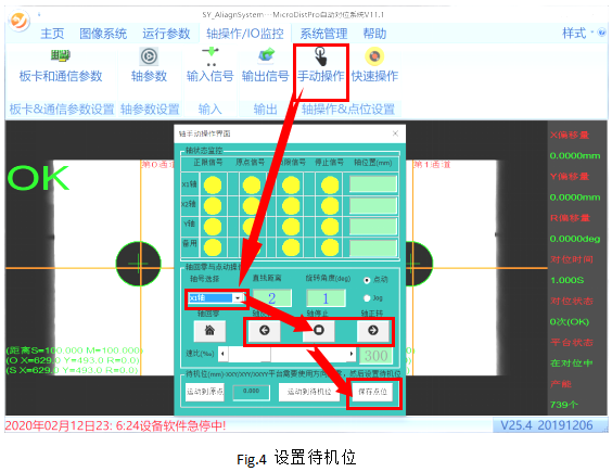 設(shè)置待機(jī)位之前需要啟動(dòng)復(fù)位進(jìn)行平臺(tái)回零,回零完成后點(diǎn)擊“軸操作/IO監(jiān)控”->“手動(dòng)操作”彈出軸操作界面,選擇X1軸,填寫點(diǎn)動(dòng)距離,通過(guò)手動(dòng)點(diǎn)擊正反轉(zhuǎn)操控X1軸到限位中間位置,最后點(diǎn)“保存點(diǎn)位”。同理設(shè)定X2軸和Y軸的待機(jī)位置,如此便完成了對(duì)位平臺(tái)待機(jī)位的設(shè)定。