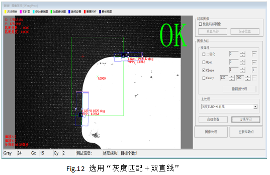 ? Step2:如圖11所示,下拉重新選擇“灰度匹配+雙直線”,黃色的模板框工具和藍(lán)色的直線工具則會(huì)顯示出來(lái),通過(guò)拖拽調(diào)整先使兩個(gè)直線工具的中線分別與產(chǎn)品的水平邊和垂直邊的邊緣相接,然后調(diào)整模板框位置和大小到合適。如圖12所示,再點(diǎn)擊“方法學(xué)習(xí)”,則學(xué)習(xí)記錄當(dāng)前的模板。注意直線工具的極性和找邊方向。