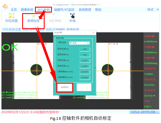 控軸軟件,系統(tǒng)全體停止的狀態(tài)下,點(diǎn)擊下圖所示的系統(tǒng)標(biāo)定按鈕,彈出標(biāo)定界面,點(diǎn)擊啟動(dòng)標(biāo)定,系統(tǒng)將控制平臺(tái)移動(dòng)和相機(jī)拍照,標(biāo)定時(shí)觀察圖像抓點(diǎn)情況,不能出現(xiàn)抓錯(cuò)、抓偏位。系統(tǒng)提示標(biāo)定完成即完成標(biāo)定。