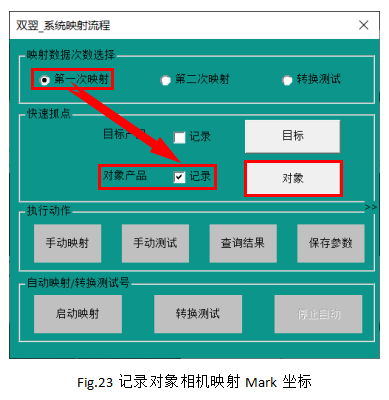 1) 系統(tǒng)全體停止的狀態(tài)下,將映射產(chǎn)品搬運(yùn)到目標(biāo)相機(jī)下,打開(kāi)映射界面,勾選第一次映射,再勾選目標(biāo)產(chǎn)品“記錄”,點(diǎn)擊“目標(biāo)”按鈕,系統(tǒng)會(huì)抓取Mark點(diǎn)的坐標(biāo)。