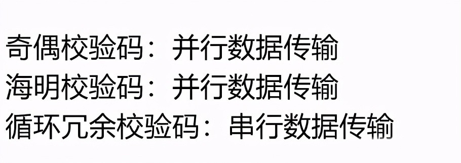 對待傳輸數(shù)據(jù)10110110約定采用其校驗時,發(fā)送方所需要發(fā)送的校驗碼為010110110,對于接收方來說,如果接收到的數(shù)據(jù)中’1’的個數(shù)不為奇數(shù)時,就會認(rèn)為數(shù)據(jù)出錯。但是它并不知道哪里出錯了,也就是它沒有糾錯的能力。