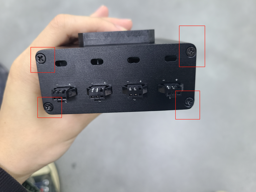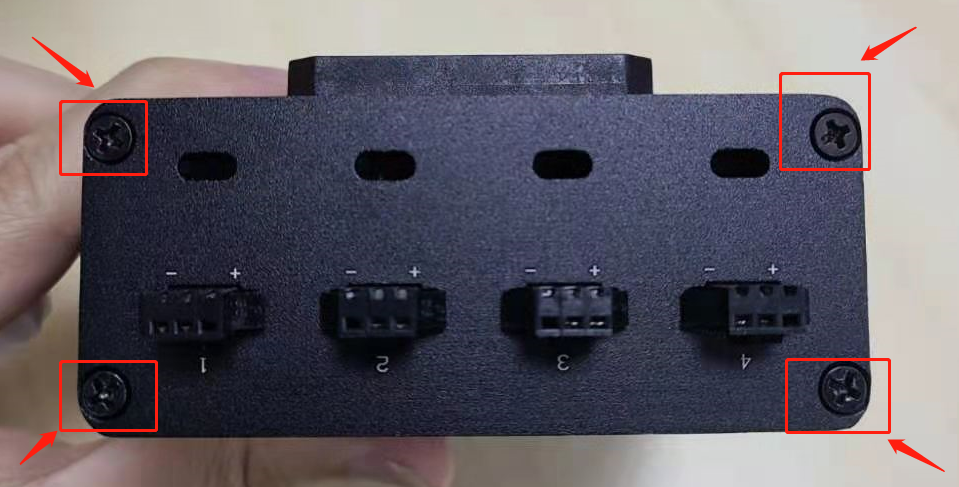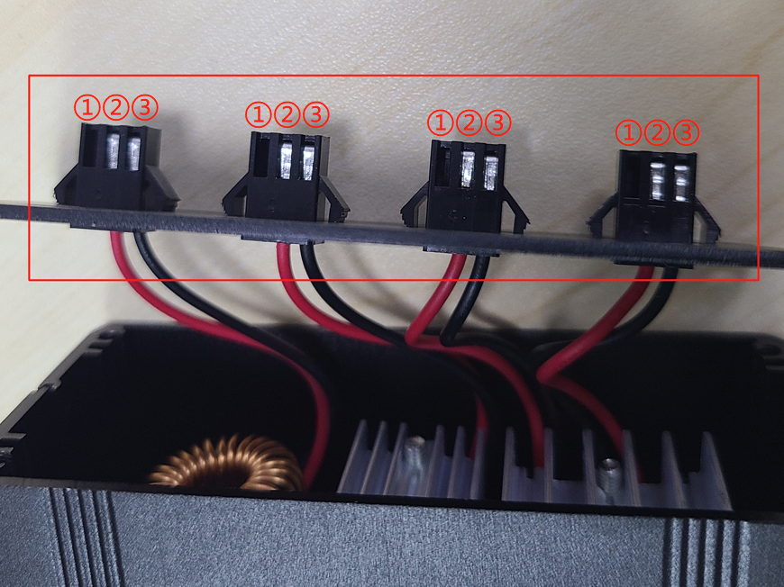 1、將光源控制器通道的螺絲擰下,找到引腳線,控制器里邊的線纜,紅色線為光源正極,黑色線為光源負(fù)極。