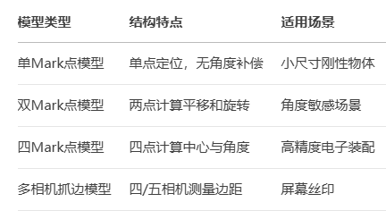 自對位模型通過機械定位確保目標物體位置固定,僅需在對象端(待調整物體)設置相機進行位置糾偏。其核心流程包括:示教模板位置→實時計算偏移量→機械糾偏→完成貼合。根據標記點(Mark點)數量與布局,主要分為以下類型: