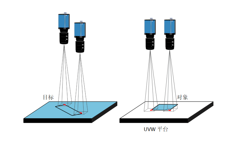 單目雙Mark映射:目標端與對象端各設一個相機,通過Mark點角度差計算偏移,精度±0.05mm,適用于FPC與鋼片貼合。
