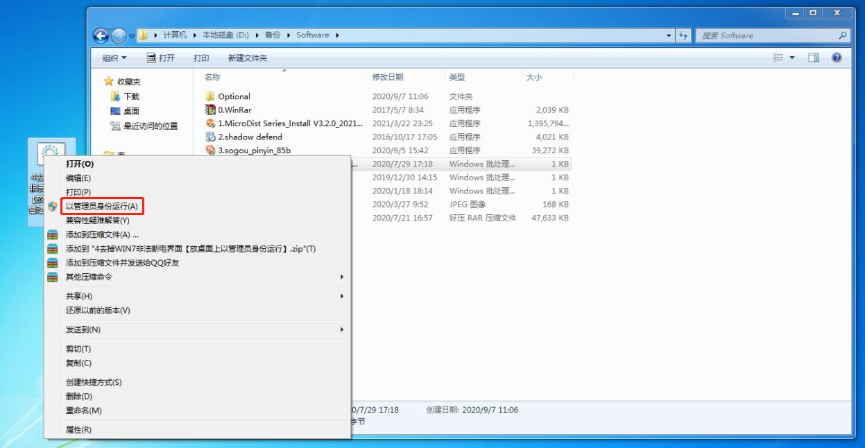 右鍵單擊“4去掉WIN7非法斷電界面【放桌面上以管理員身份運行】.bat”文件。