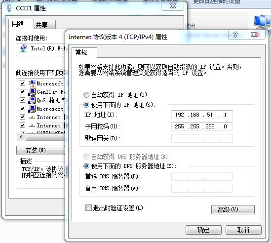 1) 先給相機插上電源線和通訊線纜,等相機藍燈常亮后配置相機IP地址;