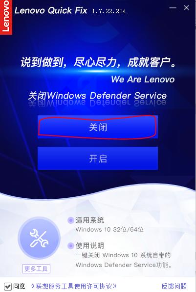 雙擊運行“關(guān)閉Windows Defender Service工具”程序,點擊“關(guān)閉”,