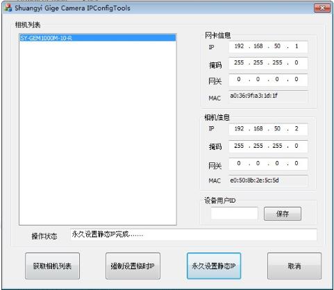 5) 填寫相機IP地址(默認192.168.50.2為CCD0,192.168.51.2為CCD1,以此類推),點擊強制設(shè)置臨時IP,系統(tǒng)會顯示強制設(shè)置臨時IP完成……