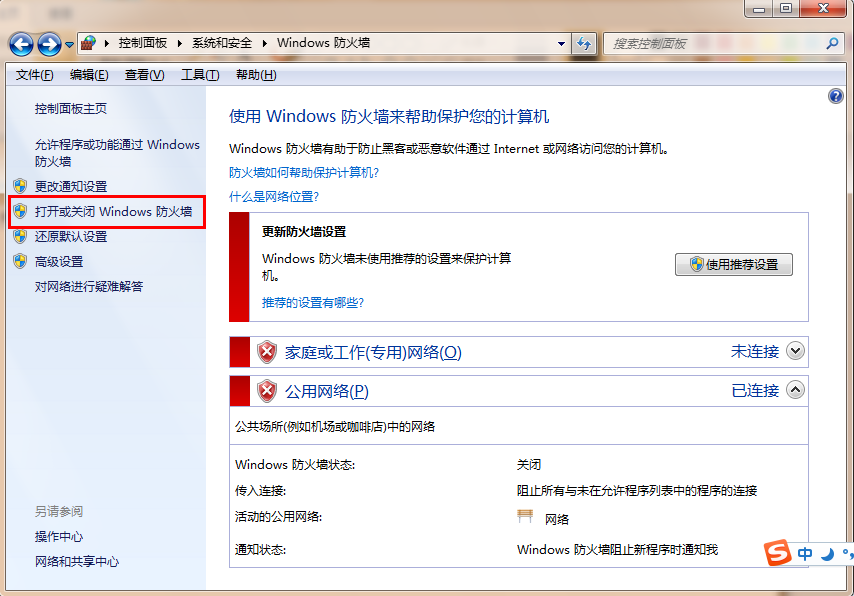 2、在“控制面板”-》“系統(tǒng)安全”-》“Windows防火墻”點擊“打開或關(guān)閉Windows防火墻”;