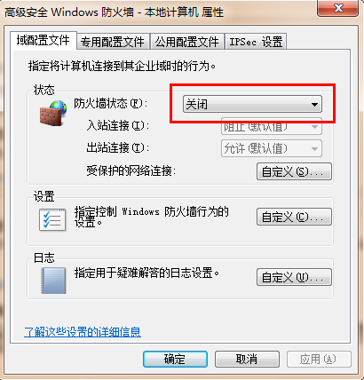 6、在“防火墻狀態(tài)”的下拉列表中選擇“關(guān)閉”;